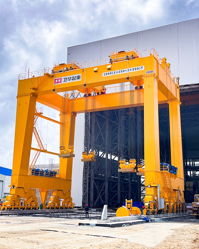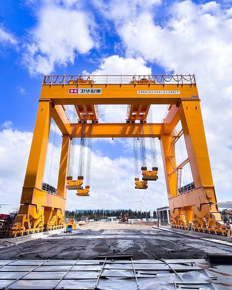 根据项目起吊重量大、工况复杂、控制精度高等特点,开元KY起重机采用U型门架结构,双龙门四点吊装,最大起吊重量1000t,最大吊点高度大于18m,采用变频+PLC控制,可实现横向、纵向距离可调,及吊梁自由旋转,控制精度达±1mm。