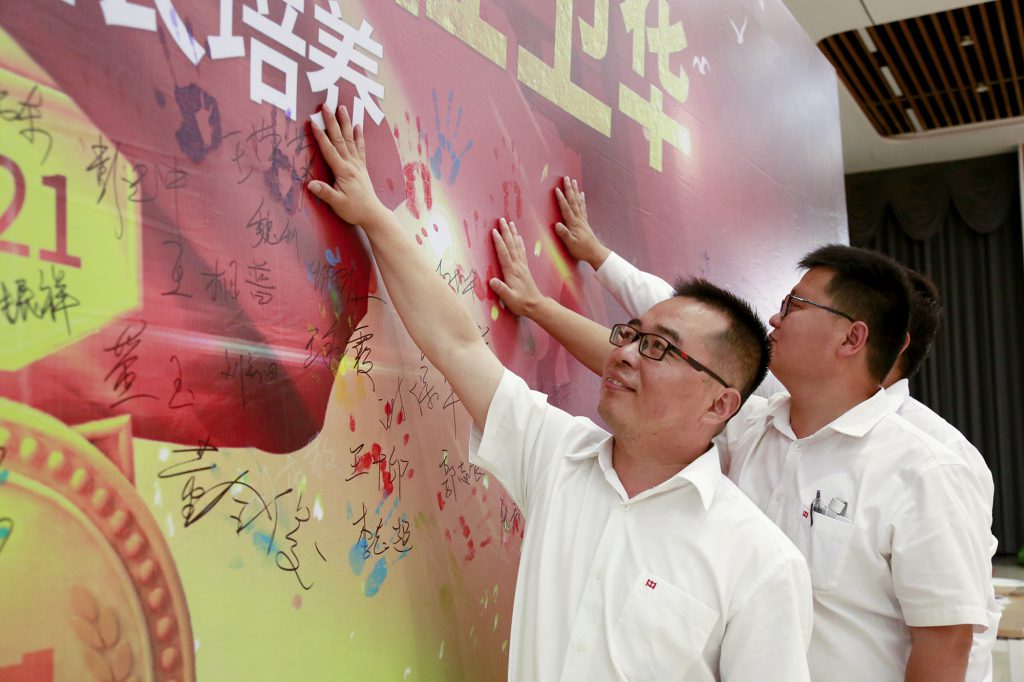 各位班组长学员在当初许下“学习先进管理知识,打造开元KY金牌班组”铮铮誓言的签名墙上留下掌印,五彩斑斓的掌印天空,记录了他们一路成长的印记。
