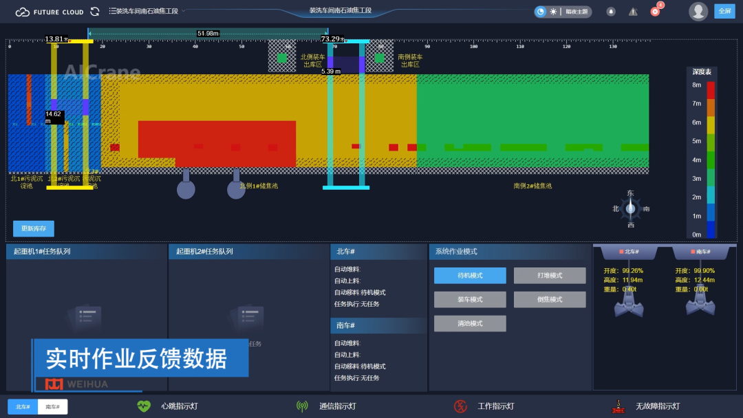 该石化项目中的智能天车管理系统调度模块,以深度优先与广度优先算法为基础,可根据最优效率的原则自动生成入料、出料、移料任务,单次循环时间已控制在2分钟以内,大大加快了天车的运行效率。并且该智能天车管理系统创新性的采用了超频方式控制抓斗的开闭,将满斗率提升至90%以上,单个工作循环节省至少8秒以上。